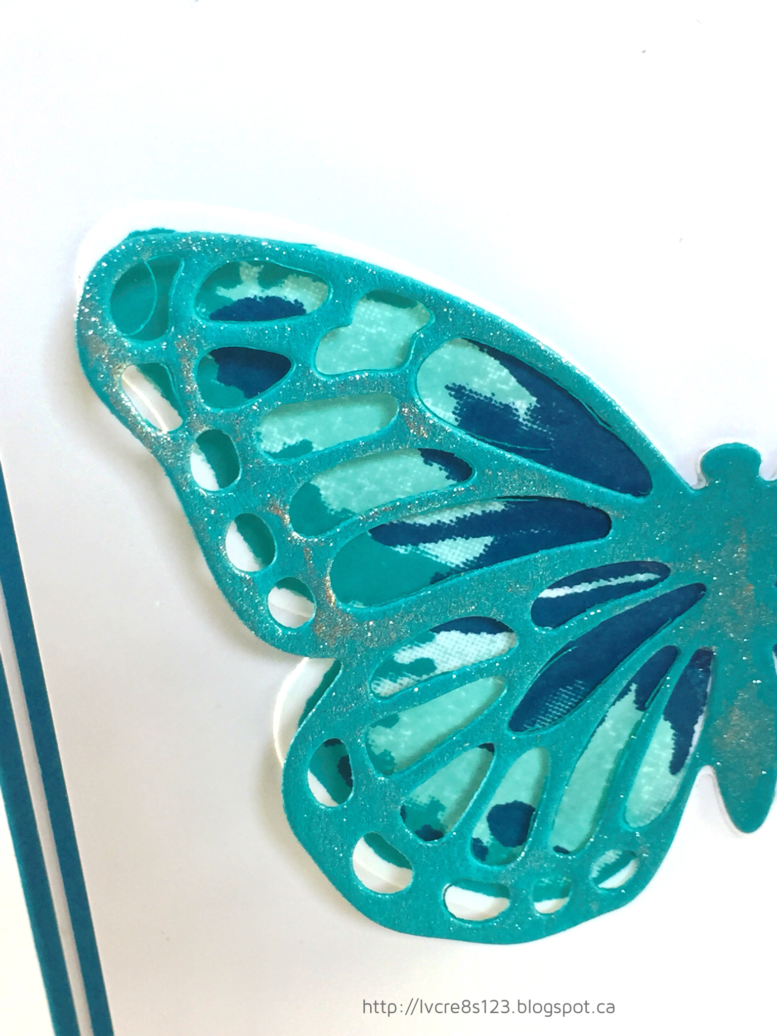 I attached the Gold Glimmer butterfly to the stamped butterfly using Crystal Effects and then attached the smaller Gold Foil butterfly on top. I liked the beautiful contrast of the clear embossed butterfly through the openings in the Gold Glimmer butterfly!
